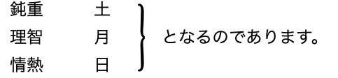 「日 月 土」を、人間の精神的性能に当はめてみれば、一番よく解るのであります。それは太陽が一番上になり、その次が月であります。